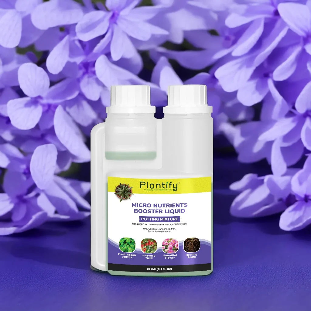 Micro nutrients booster is a liquid potting mixture, enriched with zinc, iron, manganese, copper, boron, and molybdenum for comprehensive plant nutrition