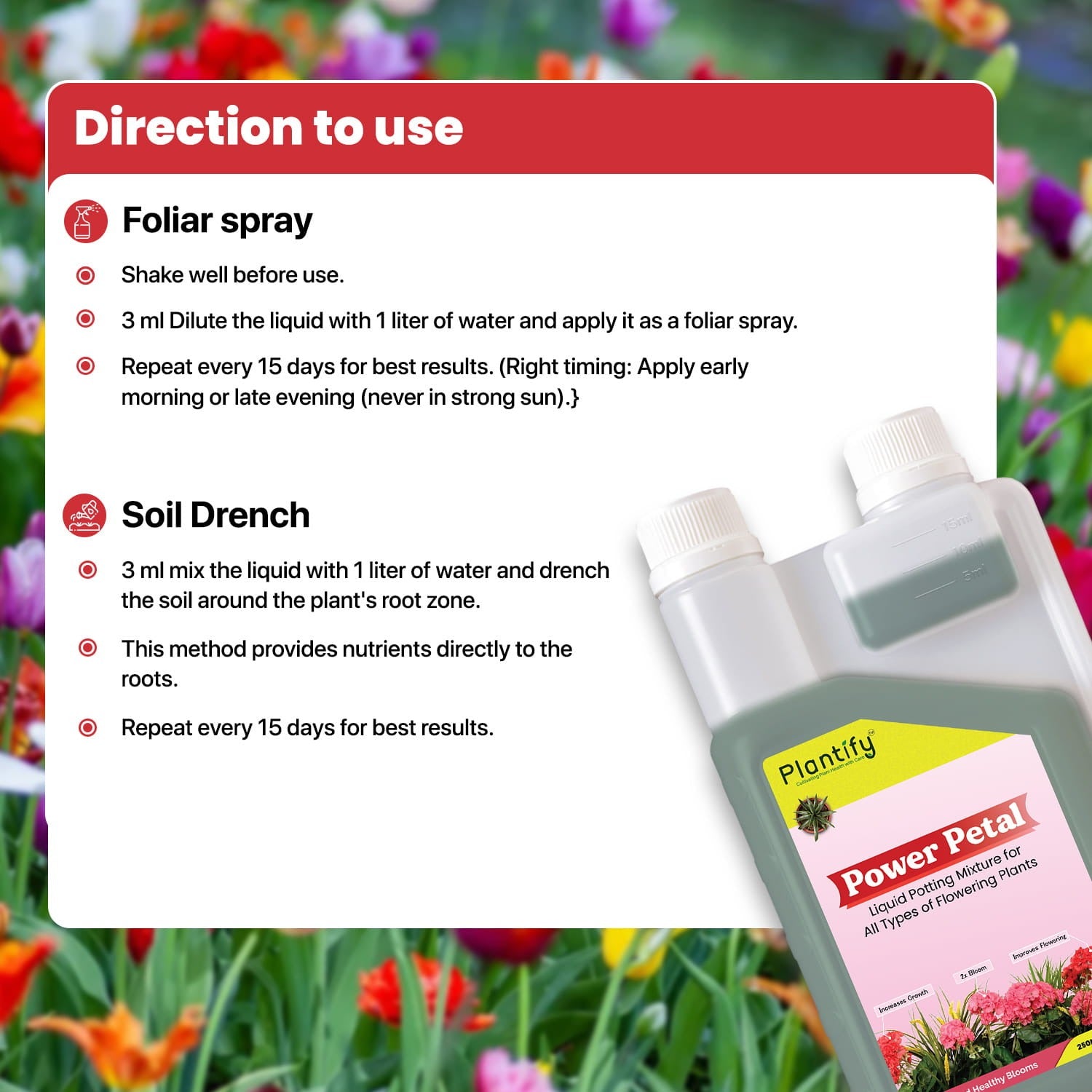 The best way is to use Plantify's Power Petal - an organic Liquid Potting mixture that adds the necessary nutrients to the plant's to grow and produce beautiful flowers.